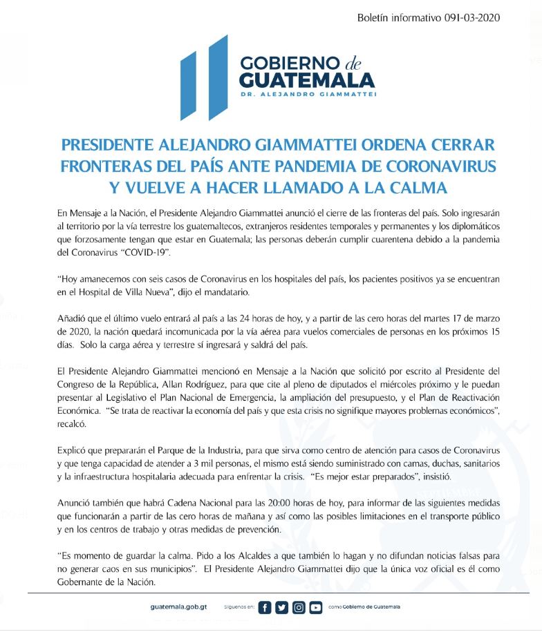 El presidente también anunció que cerrará el ingreso de extranjeros por las próximas dos semanas. “Vamos a cerrar las fronteras del país por los próximos 15 días, el último vuelo entrará hoy antes de las 24 horas”, explicó Giammattei.