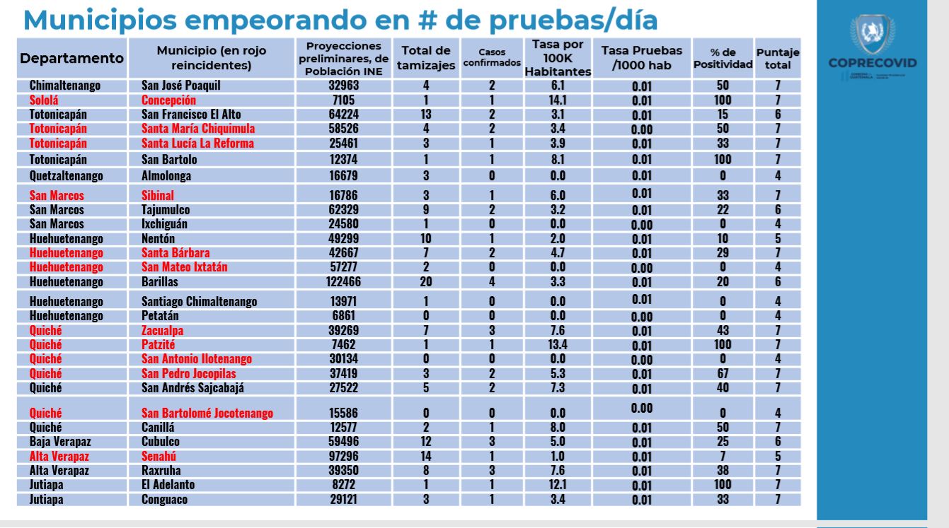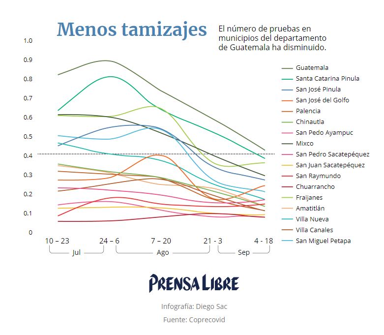 Explicó que municipios como el de Guatemala, Santa Catarina Pinula, Chinautla, Mixco y Fraijanes en algún momento llegaron a estar por encima del nivel de pruebas, pero a partir de la tercera semana de agosto “vemos una caída muy importante en el número de pruebas en cada uno de estos municipios”.
