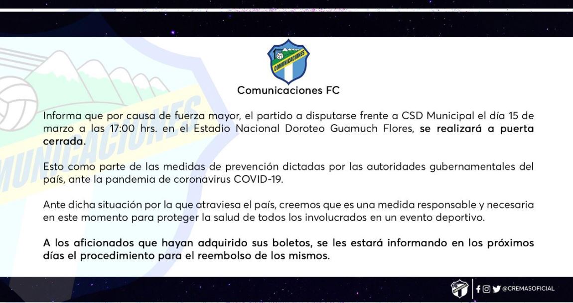 En un comunicado afirmó que Antigua GFC está comprometido con la salud de los antigüeños y la sociedad guatemalteca en general. Por esa razón, se tiene como objetivo prevenir cualquier situación por el tema del coronavirus.