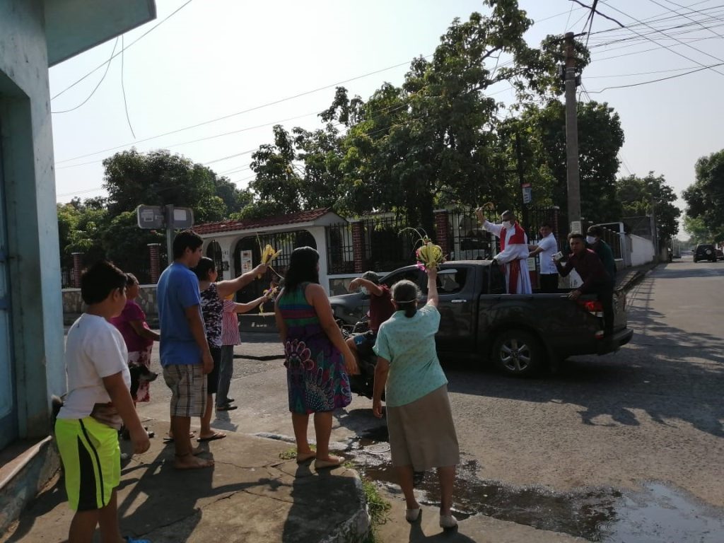 El párroco Gaitán llama a la oración para que Dios conceda paz en los corazones de todos y dio la bendición de ramos para las personas que esperaron en la puerta de sus casas.