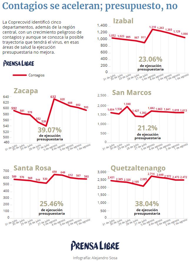 Descentralizar el problema quizás sea un movimiento clave para la estrategia, pero el presupuesto de la Dirección de Área de Salud en cada uno de esos cinco departamentos es baja: Quetzaltenango lleva ejecutado un 39.87%; San Marcos, 12.91%; Izabal, 41.35%; Zacapa, 57.37% y Santa Rosa, 25.46%, según datos obtenidos en el portal electrónico del ministerio de Finanzas.