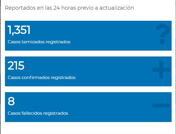En las últimas horas se reporta el deceso de ocho personas más por el covid-19 y 215 casos nuevos.