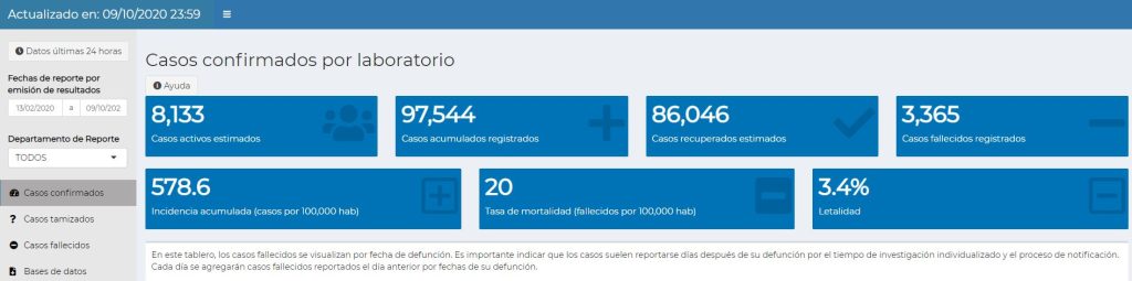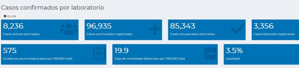 La cifra total de casos acumulados, desde el 13 de marzo último, asciende a 97 mil 544 casos, de los que se han recuperado 86 mil 46 personas y siguen con la enfermedad ocho mil 133.