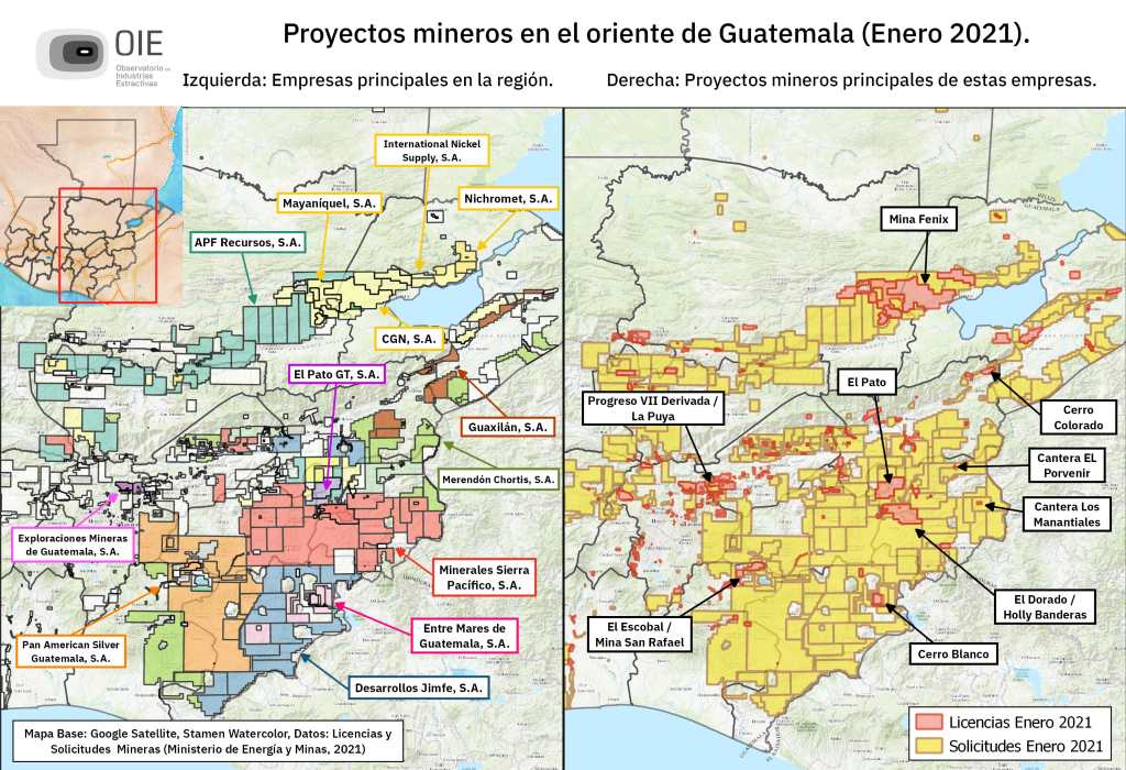 Es el oriente del país y la principal razón por la que ahí se concentren es la geológica porque en esa parte interceptan tres fallas, además que son zonas volcánicas y eso hace que haya mucha concentración de minerales como oro, plata, zinc y niquel. Todas las licencias y solicitudes mineras en la región ocupan 12 mil 618 km2 del territorio nacional donde intervienen 18 municipios ubicados en Chiquimula, Santa Rosa, Jutiapa, Jalapa, Zacapa y se están expandiendo las solicitudes hacia el nor-oriente, del lado de Izabal y el Polochic. Las empresas que lideran esto son CGN con cinco licencias mineras y Minerales Sierra Pacífico que es la empresa con más solicitudes en la región con 36 solicitudes que concentran 2,329 km2.