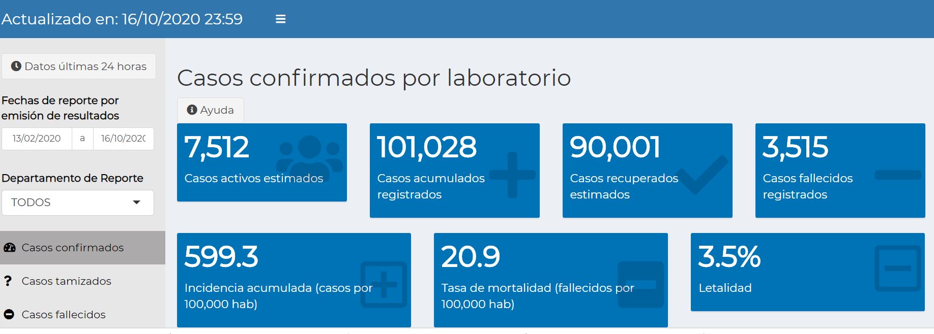 El reporte diario de casos nuevos, fallecidos y recuperados se toma del apartado “datos últimas 24 horas” del tablero del Ministerio de Salud, aunque las cifras pueden variar durante el día.