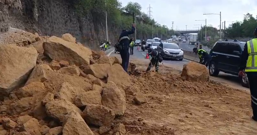Dalia Santos, portavoz de la PMT, indicó que el derrumbe mantiene bloqueado el carril derecho, lo que ha originado fuerte congestionamiento vehicular.