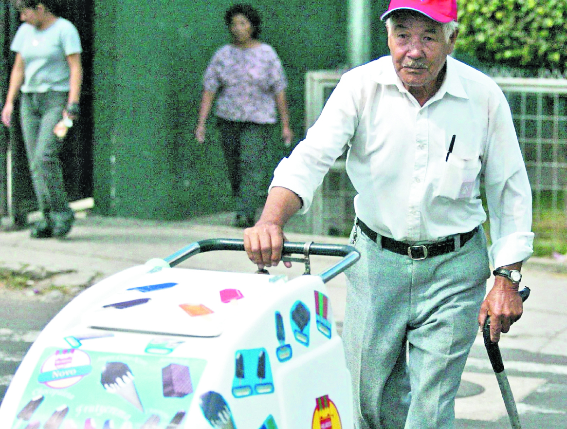 Jorge Contreras Ávila, de 72 años, vende helados para ganar el sustento. Camina a diario unos 8 kilómetros a pesar de que necesita bastón. (Foto Prensa Libre, Antonio Jiménez)