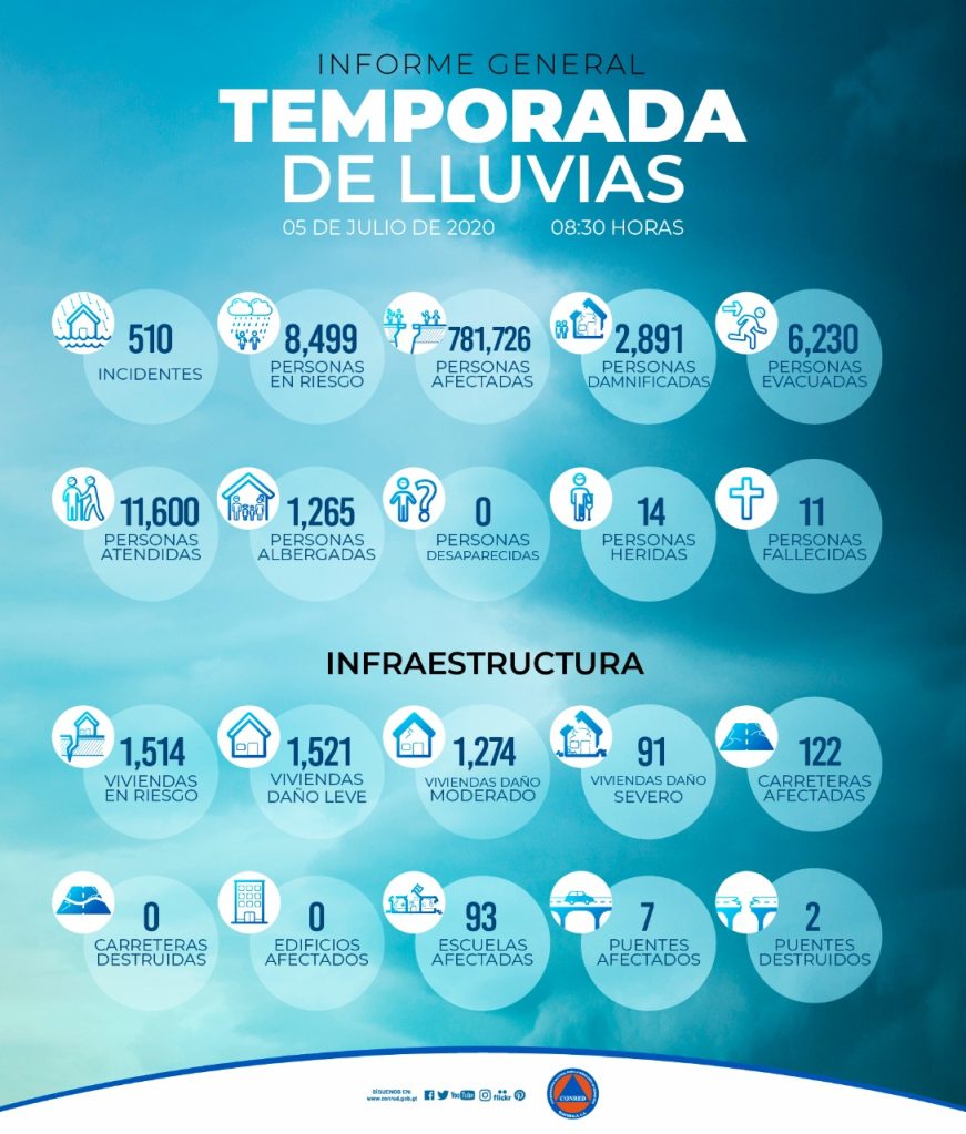 Según el reporte general de la temporada de lluvias 2020 de Conred, hasta el 5 de julio se reportan 510 incidentes, 8,499 personas en riesgo, 781,726 personas afectadas, más de 2 mil damnificadas y más de 6 mil han sido evacuadas.