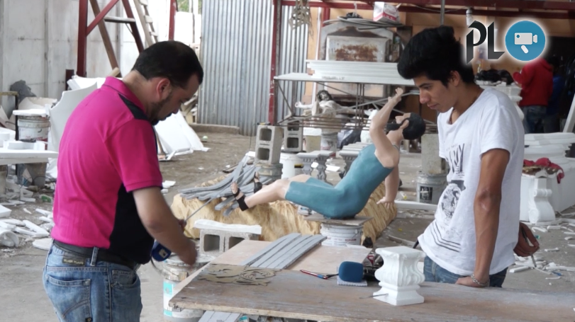 Cada proyecto arranca con estructuras de aluminio tallas y molduras, proceso que les lleva alrededor de mes y medio. La fibra de vidrio sirve para elaborar las manos, pies y rostros de las esculturas o para elaborar piezas como columnas o jarrones.