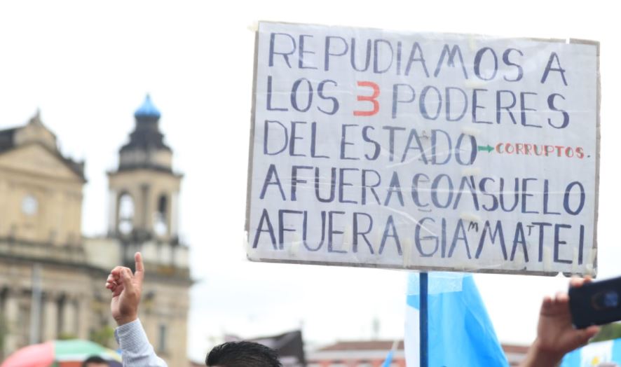 Los manifestantes exigen se manifiestan contra la corrupción; además, exigen la renuncia del presidente Alejandro Giammattei y la fiscal general del Ministerio Público (MP), Consuelo Porras.