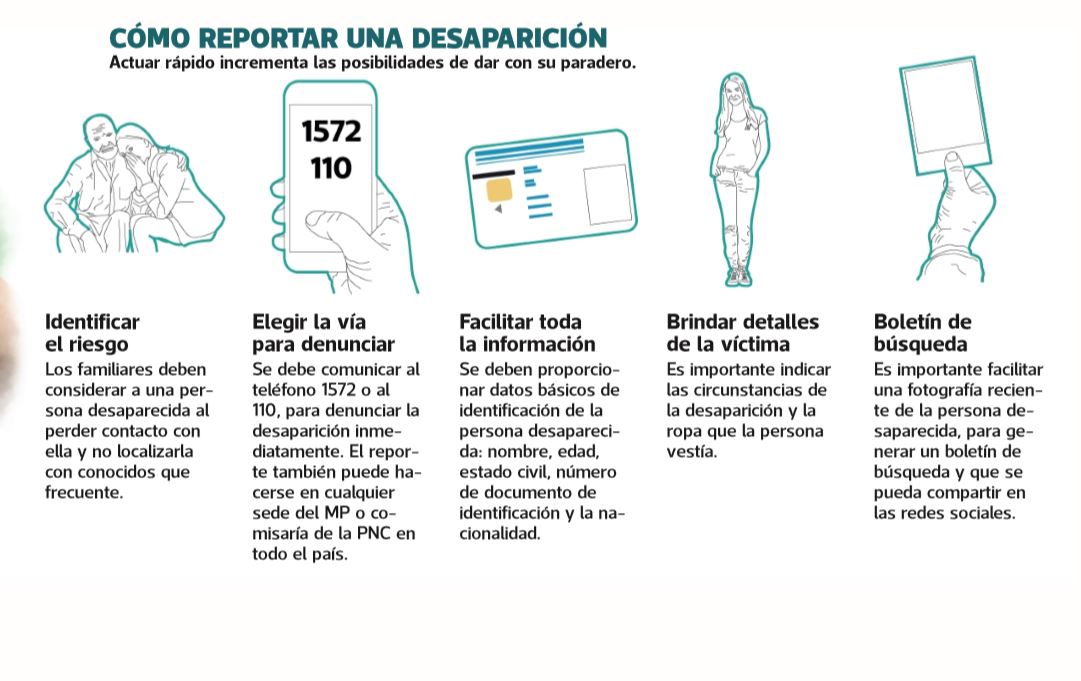 Para reportar a una persona extraviada se puede acudir a una comisaría de la PNC, al MP o hacerlo vía telefónica. Si se trata de la desaparición de un menor de edad, se debe marcar el 1546, de Alba-Keneth; si es una mujer, al 1572, de Isabel-Claudina, ambas alertas fueron creadas para atender con prontitud esos casos.