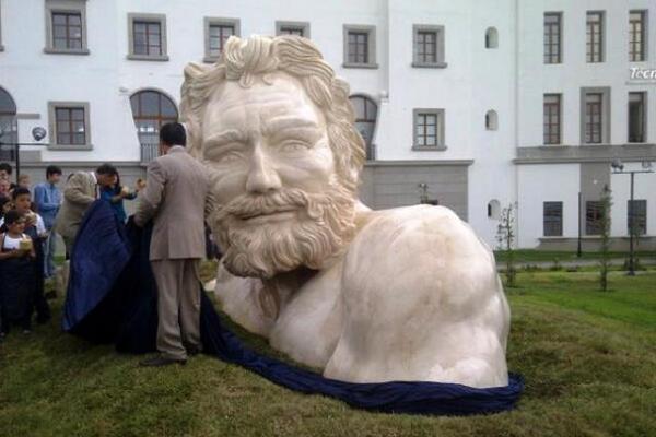El trabajo está hecho con mármol y da forma a un hombre con barba que dibuja una sonrisa tímida y ojos expresivos que emerge de la tierra. Tiene una dimensión de tres metros, según el artista.