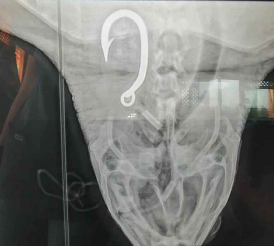 El animal fue llevado al Centro de Conservación Marina AGHN de esa área en donde le hicieron Rayos X que revelaron que la tortuga hembra también un anzuelo grande dentro de su organismo.