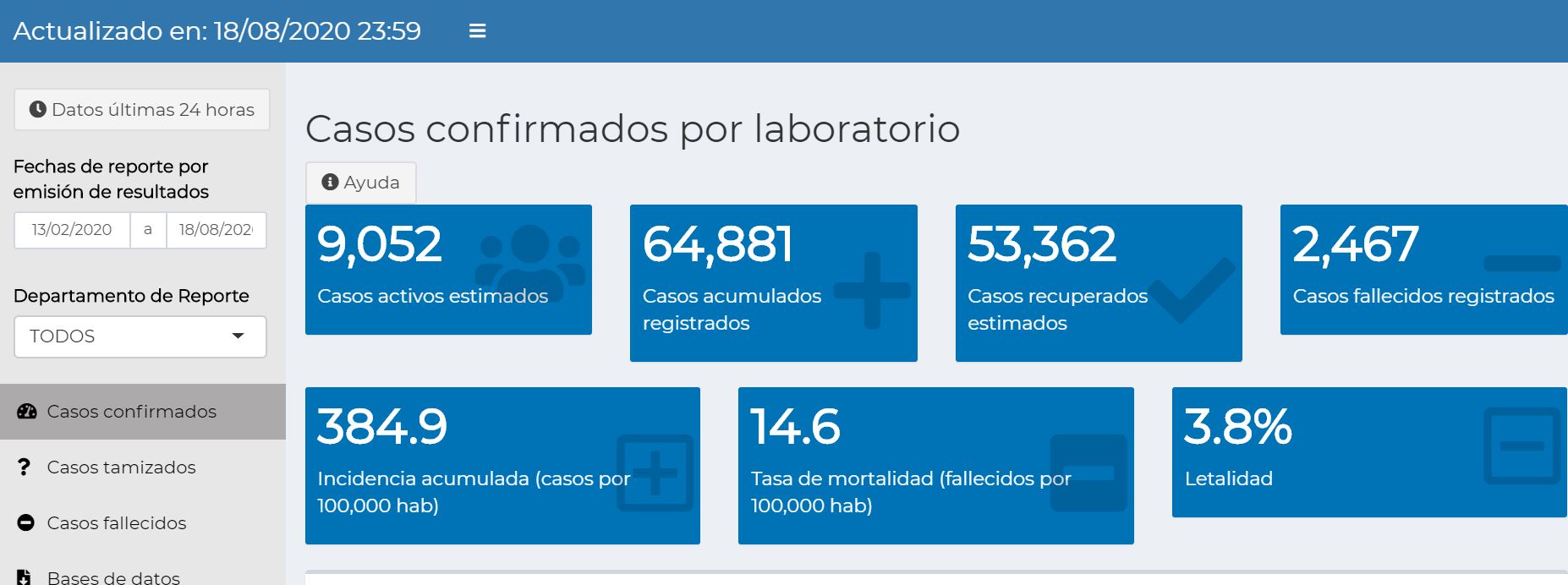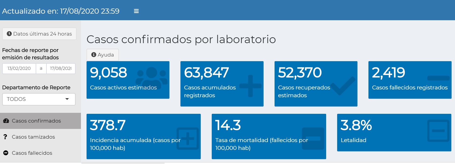 El reporte diario de casos nuevos, fallecidos y recuperados se toma del apartado “datos últimas 24 horas” del tablero del Ministerio de Salud. Aunque las cifras pueden variar durante el día.