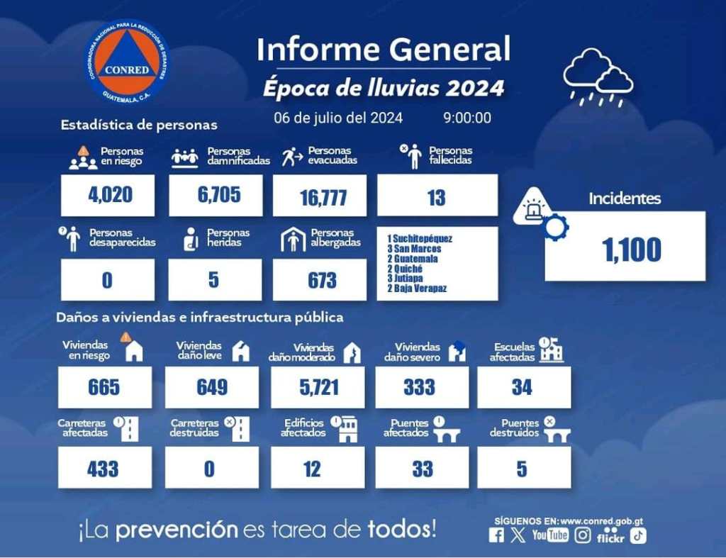 En la temporada de lluvia 2024, se reportan 13 personas muertas, 4 mil 20 en riesgo, 6 mil 705 damnificadas, 16 mil 777 evacuadas, 5 heridas y 673 albergadas.