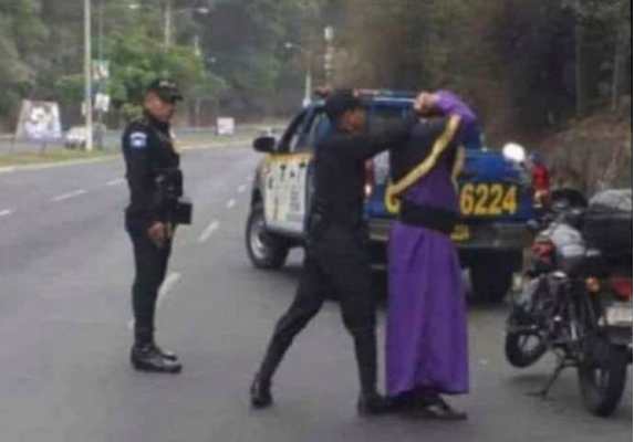 La imagen muestra al devoto cargador vestido con la túnica morada siendo revisado por un policía para revisar si no lleva armas o algo ilícito.