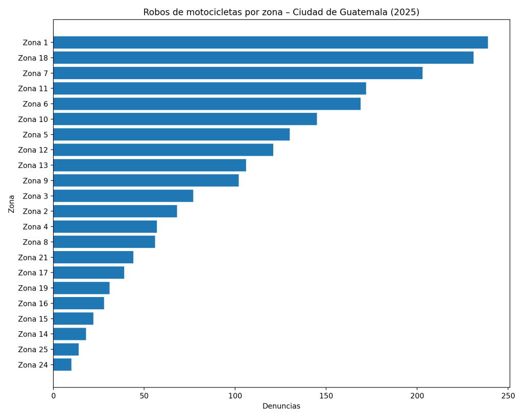 Según datos del Ministerio Público (MP), en el 2025 se reportaron 239 robos de motocicletas en la zona 1, la cifra más alta entre todas las zonas de la ciudad. Le siguieron la zona 18, con 231 denuncias, y la zona 7, con 203 casos.
