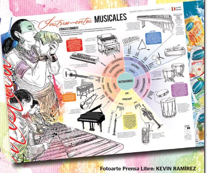 La ilustración muestra los cinco grupos instrumentales, de acuerdo a cómo generan el sonido: cordófonos, membranófonos, aerófonos, idiófonos y electrófonos.
