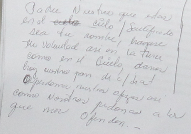 La palabra “perdona” es el sentimiento de culpa remarcado, típico del angustiado ante la irreverencia de sus actos. Este rasgo se hace más notorio en óvalos, véase el ejemplo de la “o” denota angustia, al signo tipo “uña de gato” predominante en la parte alta de la letra.