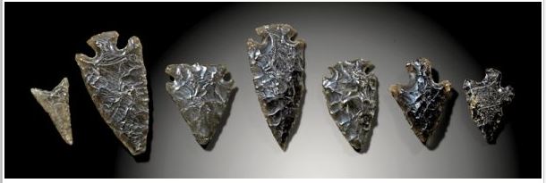 Período Preclásico Maya. Aproximadamente 3000 AC 250 dC. Lote de 10 puntas de lanza con marcas de astillado en la hoja. Obsidiana. Largo 9.2 alto 2.8 cm. De la colección privada alemana O. Schwarzwälder, adquirido en el comercio de arte alemán entre 1980-1994. Precio base €800. (Foto Prensa Libre: Tomada de Gerhard Hirsch Nachfolger)
