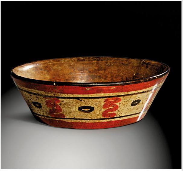Período Clásico Tardío Maya. Aproximadamente 550 – 950 dC. Cuenco con pintura en la pared exterior, que muestra círculos y un motivo ondulado en rojo y negro sobre un fondo claro. 16.2 cm. Adquirido en el comercio de arte alemán a principios de la década de 1980, desde entonces en una colección privada en el sur de Alemania. Precio base €400. (Foto Prensa Libre: Tomada de Gerhard Hirsch Nachfolger)