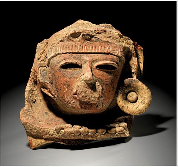 Período Posclásico Maya. Aproximadamente 900-1200 d. C. Fragmento de cabeza de una figura hueca de un dignatario con aretes anchos, nariguera y collar. Alto 12.1 cm. De la colección privada alemana O. Schwarzwälder, adquirido en el comercio de arte alemán entre 1980-1994. Precio bases €350. (Foto Prensa Libre: Tomada de Gerhard Hirsch Nachfolger)