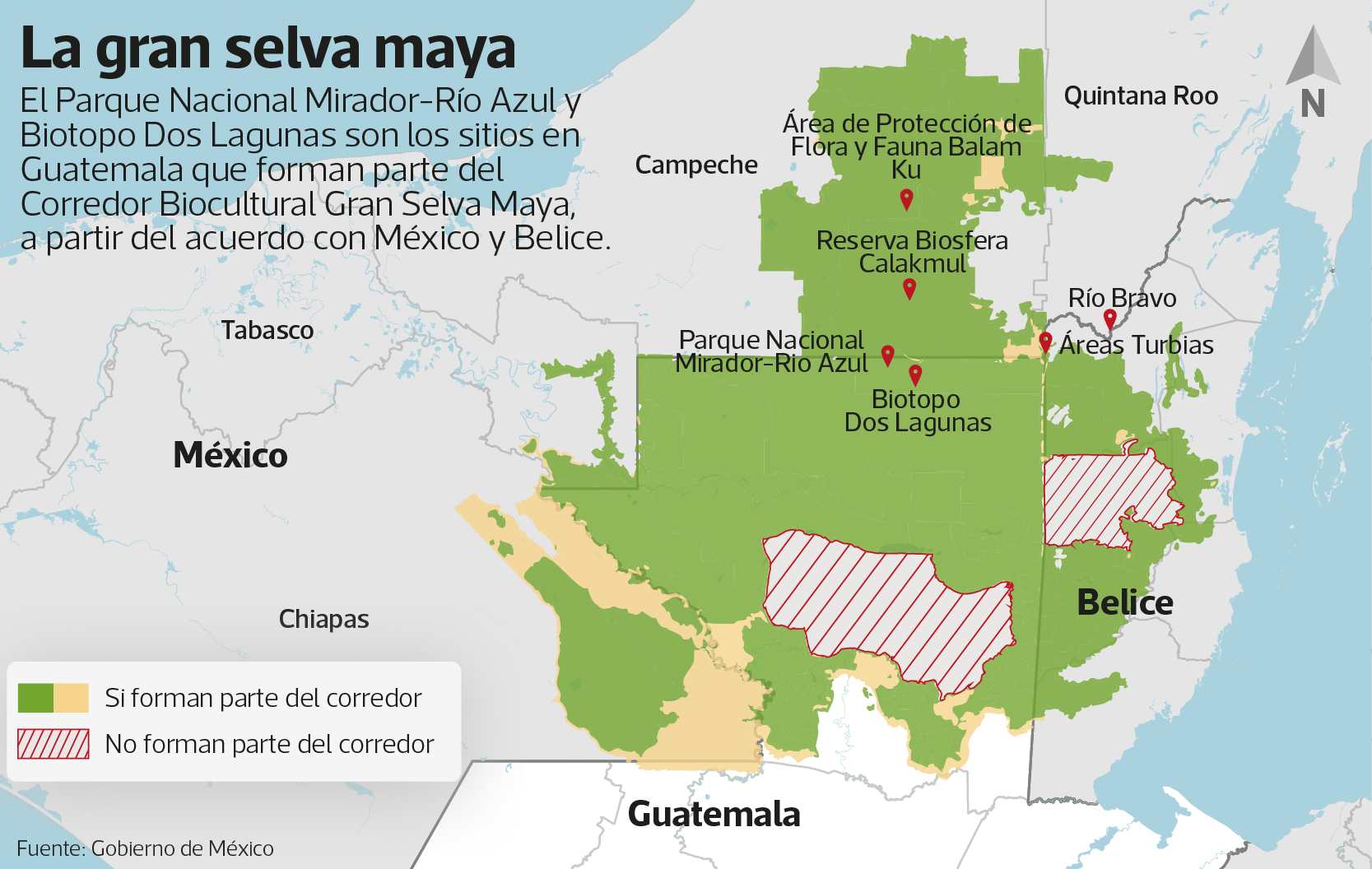 El acuerdo firmado por Guatemala, México y Belice establece la protección del “Corredor Biocultural Gran Selva Maya”, conformado por 27 áreas protegidas en Guatemala, 12 en México y 11 en Belice. Entre ellas destacan el Parque Nacional Mirador-Río Azul y el Biotopo Dos Lagunas en Guatemala; la Reserva de la Biosfera Calakmul y el Área de Protección de Flora y Fauna Balam Kú en México; y, en Belice, el Área de Conservación y Manejo Río Bravo y el Área Natural Protegida Áreas Turbias.