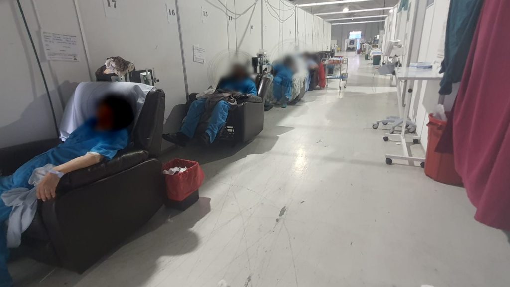 El hospital construido en el Parque de la Industria tampoco está en las mejores condiciones. Aunque instalaron catres proporcionados por la Coordinadora Nacional para la Reducción de Desastres (Conred) y unos sillones que les enviaron del San Juan de Dios, todas las áreas se encuentran llenas y los médicos están cansados.