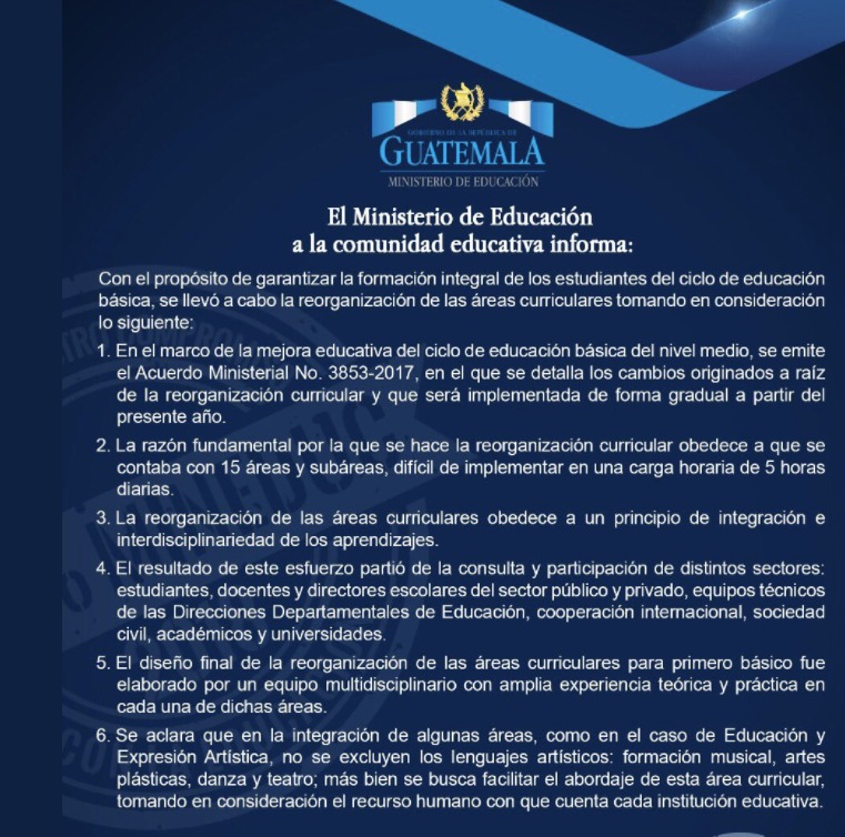 “Para empezar el año 2018, la sorpresa de la publicación del Acuerdo Ministerial 3853-2017 que reforma el Acuerdo Ministerial 178-2009, donde modifican las áreas y suprimen las subáreas de música y artes plásticas, que eran las que siempre se habían mantenido”, citó el documento.