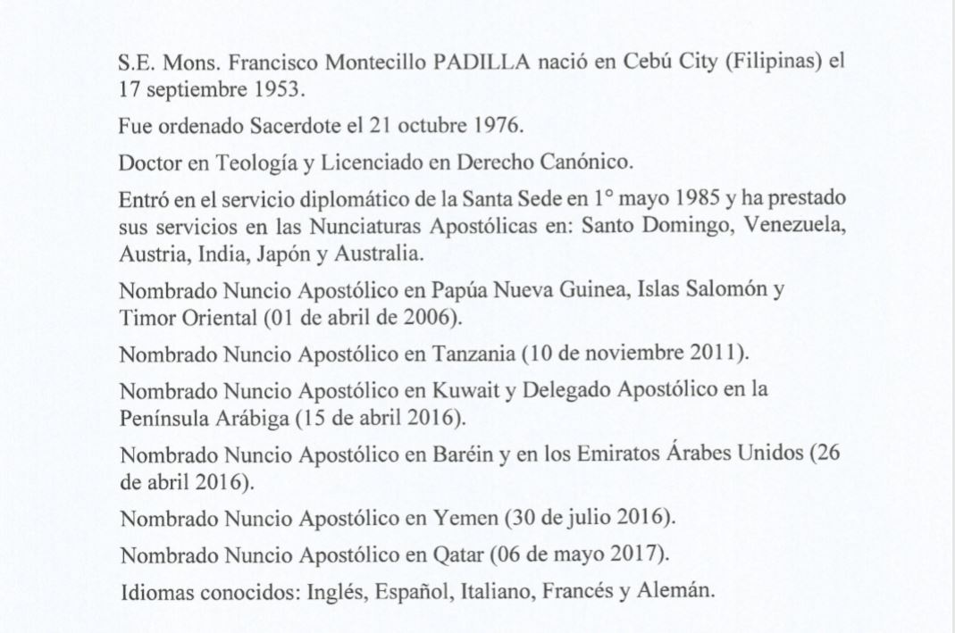 Monseñor Montecillo Padilla sustituirá en el cargo a Nicolás Thevenin, quien fue nombrado nuncio en la República Árabe de Egipto y delegado en la Liga de Estados Árabes.