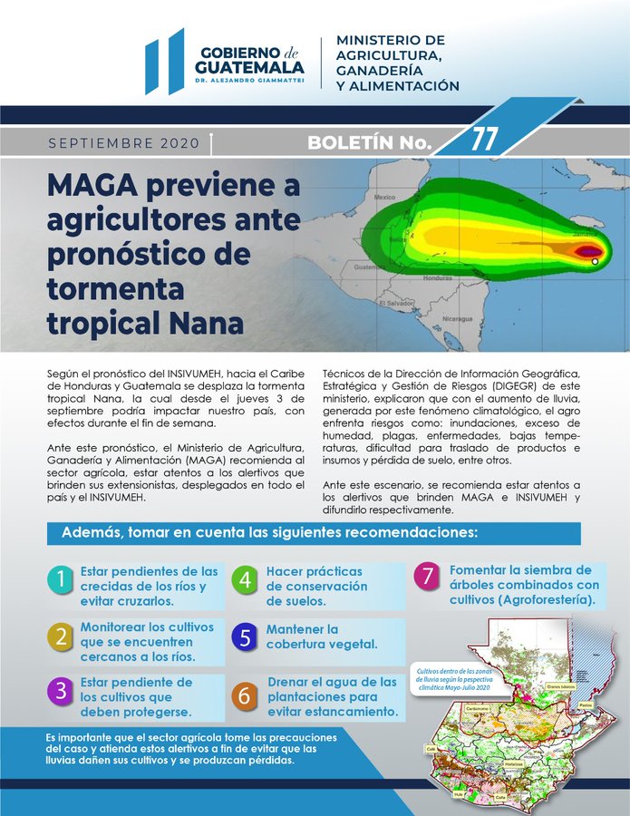 El Ministerio de Agricultura y Alimentación emitió una alerta al sector agrícola debido a la llegada de Nana que amenaza con causar daños a cultivos debido a inundaciones, exceso de humedad, plagas, bajas temperaturas, pérdida de suelos y dificultad para el traslado de productos.