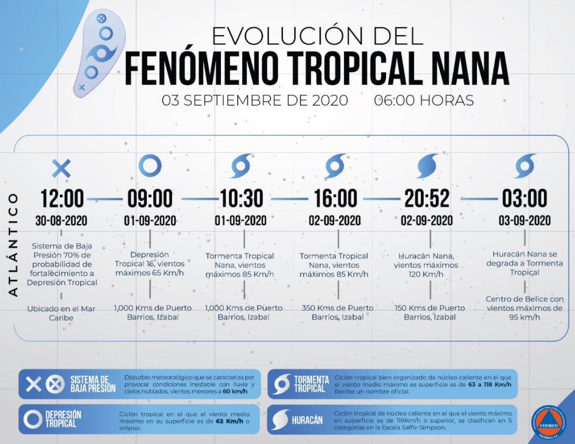 El reporte de la Conred de este 3 de septiembre a las 6.30 hora da cuenta que la Tormenta Tropical Nana actualmente está sobre Petén y avanza con vientos de 95 kilómetros por hora. Nana continuará favoreciendo nublados, lluvias y fuertes vientos sobre la mayor parte de la zona norte del país, así como el Caribe y la Franja Transversal del Norte. En el resto del país se registrarán lluvias y actividad eléctrica en la tarde y noche, propiciadas por la época y favorecidas por el paso de Nana.