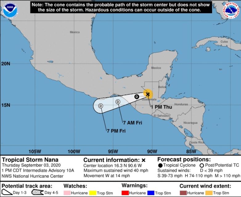 La Coordinadora Nacional para la Reducción de Desastres informa que Nana se encuentra en Petén luego de haberse degradado a tormenta tropical por su paso en Belice y se dirige hacia Chiapas, México, pero también causará lluvia en Alta Verapaz, Quiché y Huehuetenango.