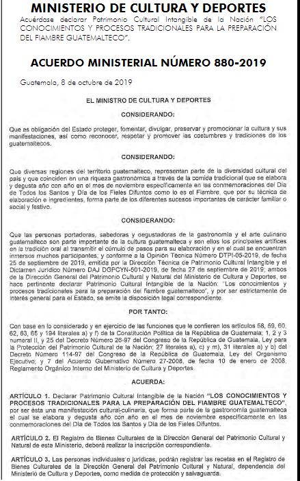 A través del Acuerdo Ministerial 880-2019, el Ministro de Cultura y Deportes, Elder Súchite Vargas, declara a los Conocimientos y Procesos Tradicionales de la Elaboración del Fiambre como Patrimonio Cultural Intangible de la Nación. pic.twitter.com/nEOTAbaoeZ