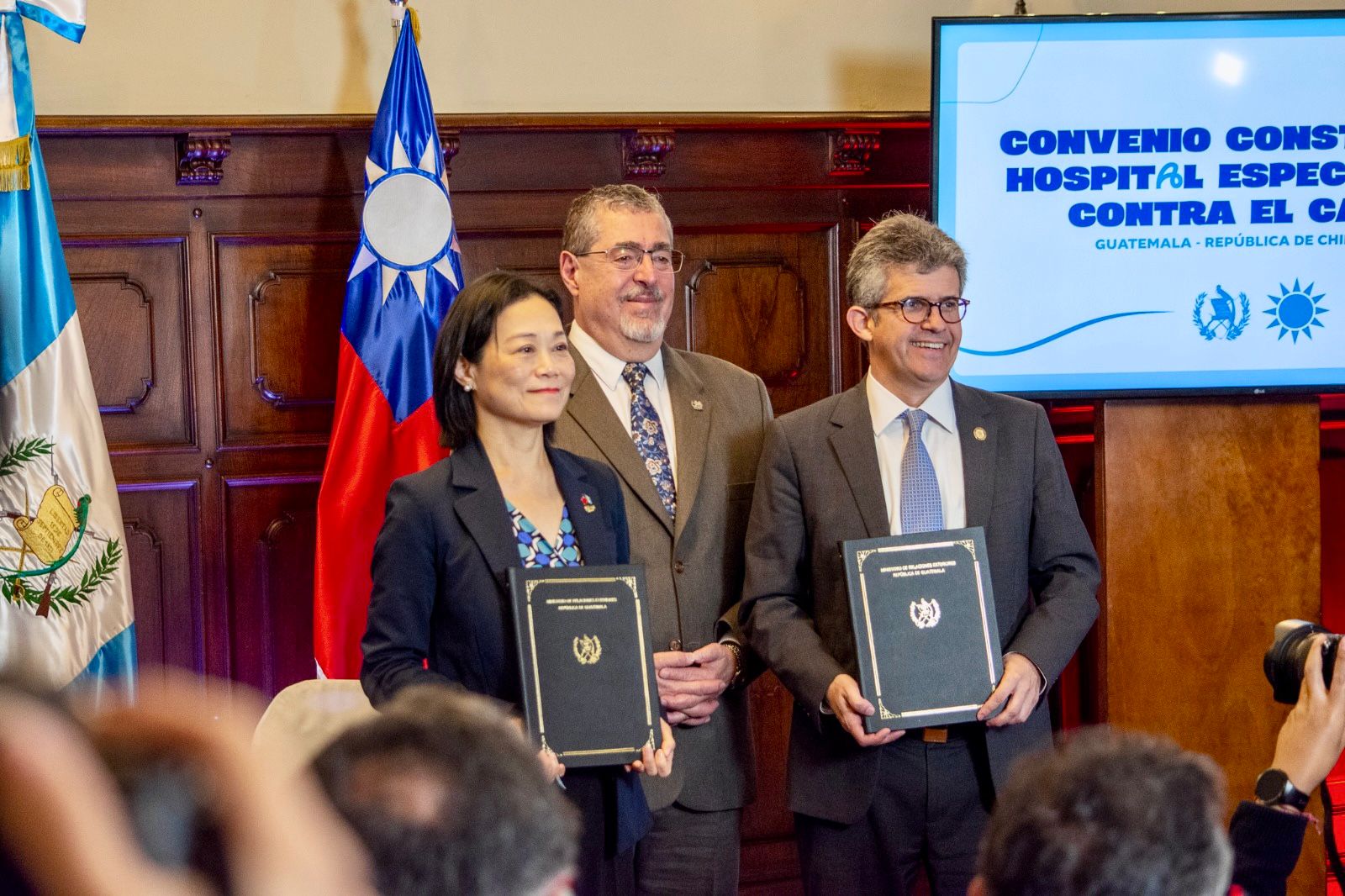 Vivia Chang, embajadora de China Taiwán en Guatemala, y el ministro de Salud, Joaquín Barnoya, firman un convenio para construir el hospital especializado contra el cáncer. A la actividad asiste el presidente Bernardo Arévalo. (Foto Prensa Libre: Ministerio de Salud)