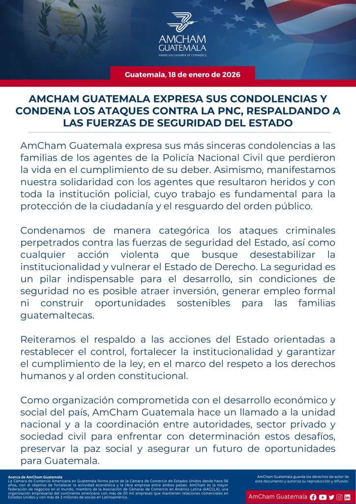 La Cámara de Comercio Americana en Guatemala (Amcham) emitió condolencias a las familias de los agentes de la PNC fallecidos en los ataques armados y manifestó solidaridad con los uniformados heridos.