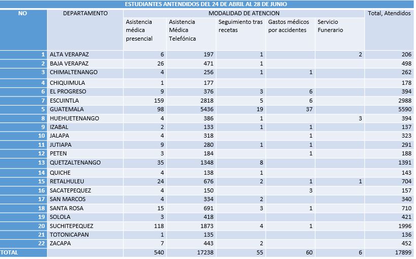 Hasta el 28 de junio último el seguro médico escolar atendió a 17 mil 899 estudiantes de preprimaria y primaria, el 97% de los niños fueron asistidos a través de una llamada telefónica, siguiendo el concepto de telemedicina.
