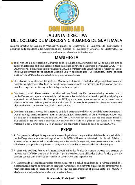 El Colegio exige al Congreso restituir a Salud esos Q600 millones y al Ministerio de Salud que que utilice esos fondos de manera urgente para comprar vacunas contra el covid-19.