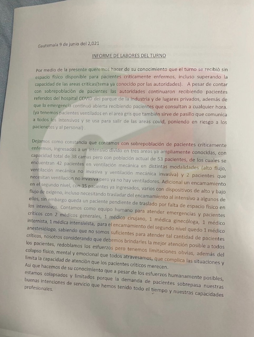 En la carta se señala que en las áreas para pacientes críticos se ha superado la capacidad, pero que se sigue atendiendo a pacientes referidos del hospital del Parque de la Industria y privados; además, aseguran que, dada la saturación, hay pacientes ventilados en áreas que también sirven de pasillos.