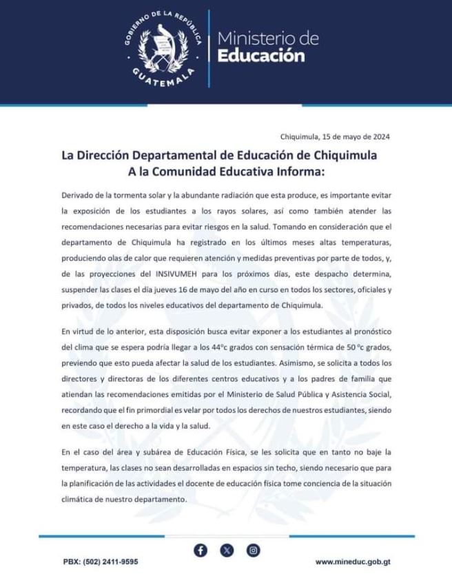 Este mismo miércoles, la Dirección Departamental de Educación de Chiquimula anunció la suspensión de clases el próximo 16 de mayo en todos los establecimientos oficiales y privados debido a la ola de calor registrada.