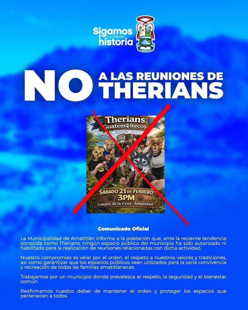 La comuna de Amatitlán advirtió el 20 de febrero en sus redes sociales: “Ante la reciente tendencia conocida como therians, ningún espacio público del municipio ha sido autorizado para reuniones relacionadas con dicha actividad. Nuestro compromiso es velar por el orden, el respeto a nuestros valores y tradiciones. No a las reuniones therians”.