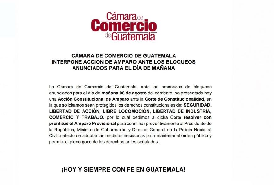 El Instituto Guatemalteco de Turismo (Inguat) por medio de un comunicado manifestó que el sector turístico ve con preocupación que representantes de Codeca hayan anunciado y confirmado manifestaciones para este martes 6 de agosto desde las 6 horas, con lo que se hará imposible el derecho a la libre locomoción de personas y transporte de todo tipo, garantizado en el artículo 26 de nuestra Carta Magna.