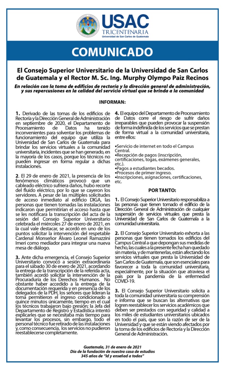 En el comunicado el CSU informó que el 29 de enero por fuertes vientos un cableado eléctrico tuvo daños y se cayeron los servidores. Ante ello, se requirió a los estudiantes que permitieran el ingreso de técnicos a las instalaciones, pero la respuesta fue que se permitiría el acceso hasta que se les entregara copia de un acta del CSU del 27 de enero, en la cual uno de los puntos fue solicitar la intervención del cardenal monseñor Álvaro Ramazzini como mediador.