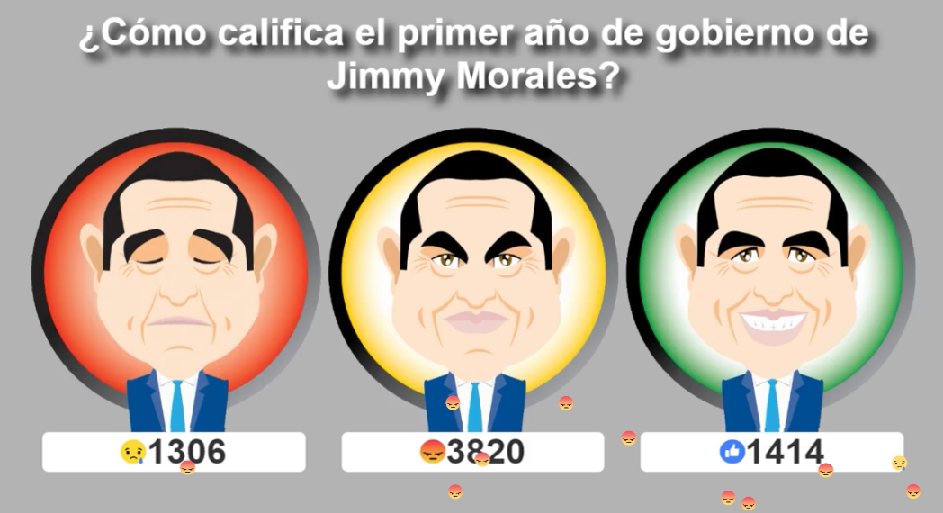 A los cibernautas se les preguntó: ¿cómo calificarían la gestión del primer año de Jimmy Morales? Las opciones de voto fueron medidas por las reacciones de Facebook “me triste”, “me enoja” y “me gusta”.