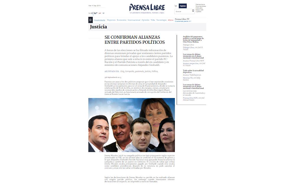 Dicha página destaca una nota titulada “se confirman alianzas entre partidos políticos”, en la cual se desacredita a Jimmy Morales, candidato presidencial del Frente de Convergencia Nacional (FCN-Nación), quien en la Encuesta Libre apararece en el primer lugar de intención de voto para este 6 de septiembre.