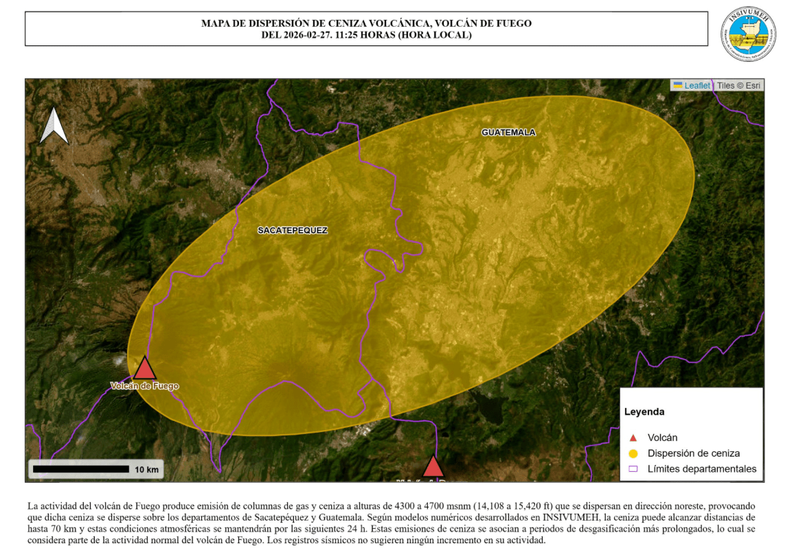 El Insivumeh recomendó a la Dirección General de Aeronáutica Civil (DGAC) considerar la dispersión de ceniza en un radio de 15 a 40 kilómetros hacia el este y noreste.