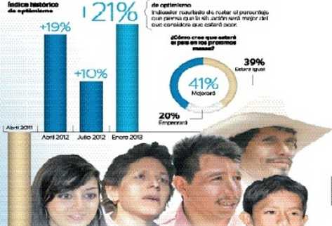 El optimismo general del país ha variado de -21 en abril del 2011 a +19 en abril del año recién pasado, y +10 en julio del 2012, hasta alcanzar +21 en la medición de enero de este año.