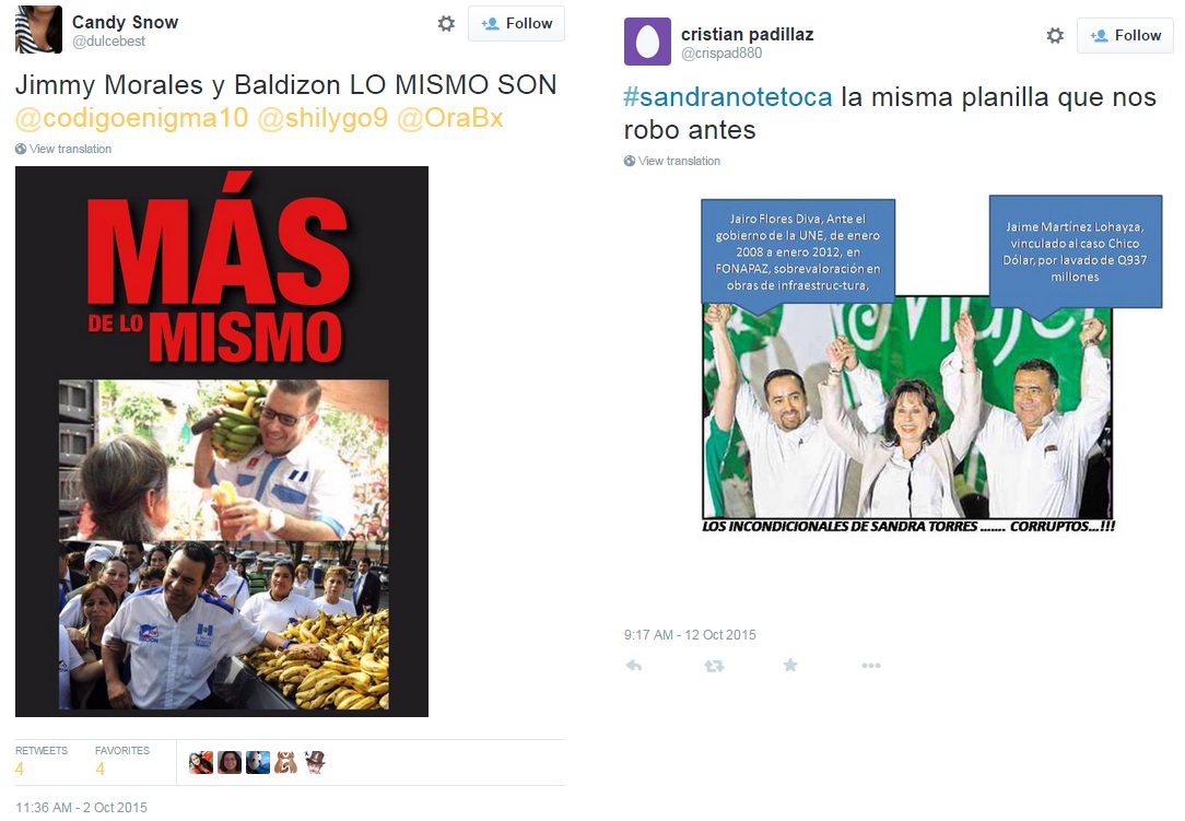 Ambos políticos tienen presencia en la red social Twitter. La cuenta @SandraTorresGUA, por ejemplo, mantiene una interacción constante en dicha red; mientras que @JimmyMoralesGT comparte sus actividades proselitistas.