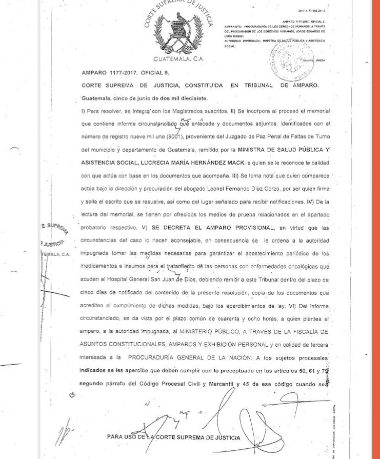 La Corte Suprema de Justicia (CSJ) amparó provisionalmente a los pacientes con cáncer para que en el Hospital General San Juan de Dios se les brinde su medicamento, esto después de la Procuraduría de Derechos Humanos (PDH) presentara una acción.