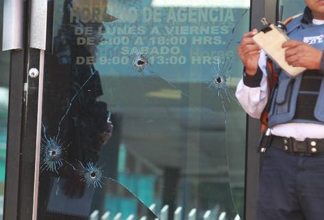 Cuatro perforaciones de bala quedaron en la puerta de la agencia bancaria (Foto Prensa Libre: E. Paredes)